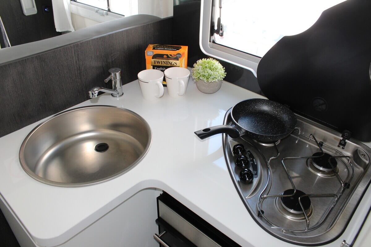 The camper has a refrigerator with freezer. There is a TV/DVD combination with satellite dish and a built-in Pioneer/radio/Apple play with DAB audio system. There is a hanging area for clothes and many cupboards and compartments. The front seats can be turned so that you can eat at the table. Under the table is an extendable leaf, creating more dining space.