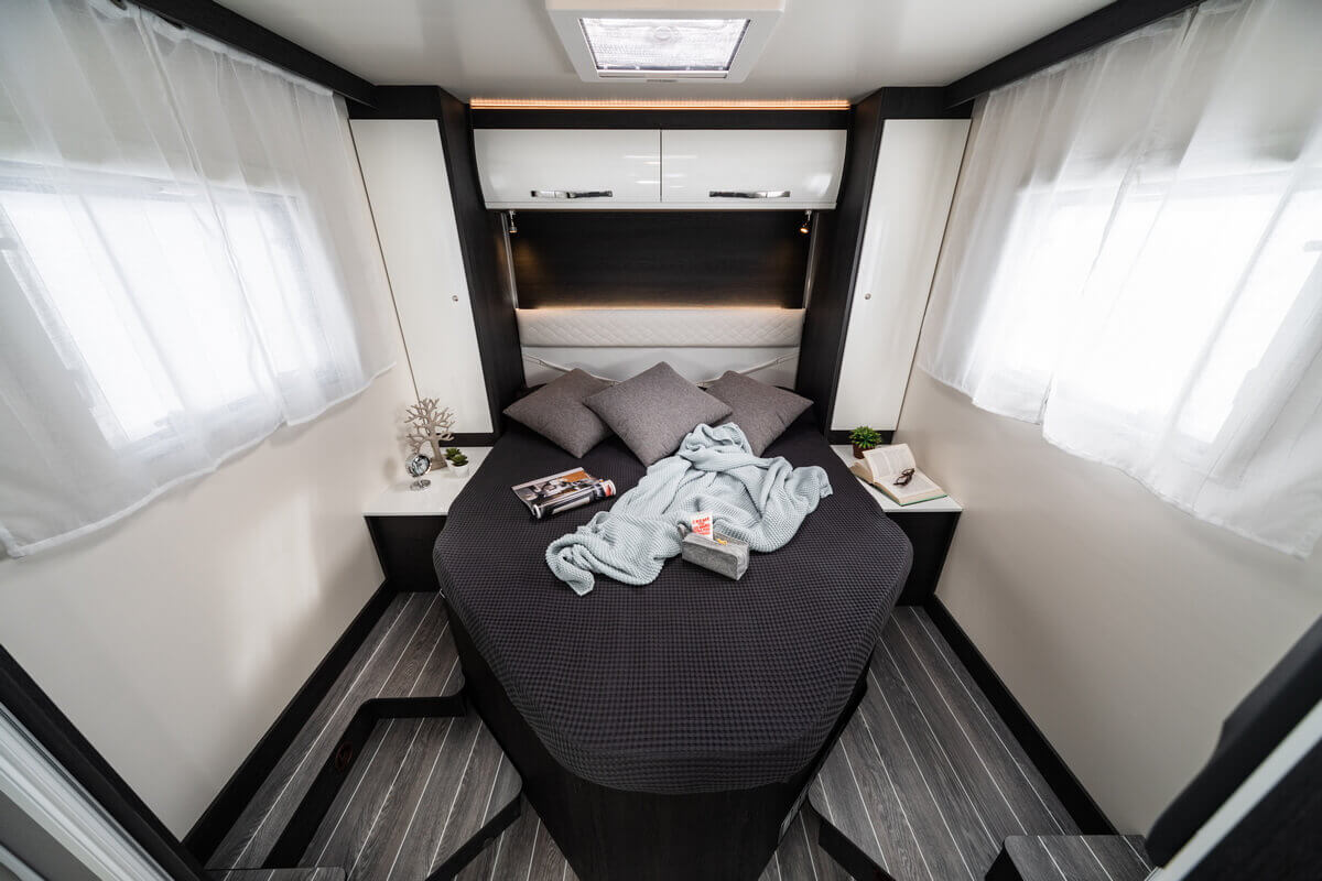 Our beautiful, complete Burstner ixeo 674 semi-integrated camper from 2010 is suitable for 4 people. This camper is 6.74 long and has 2 large width beds. A fixed bed in the back, accessible by 2 steps with lighting. Above the bed a shelf where you can put a glass and a socket to charge your mobile, this part can be shielded by a curtain. Above the seating area is a pull-down bed for 2 people.
